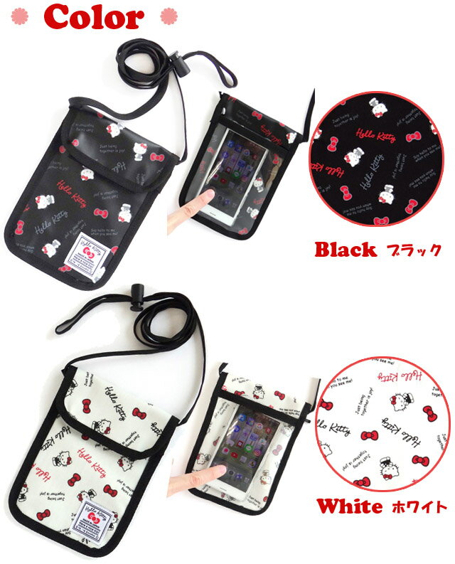 ハローキティ スタンダードロゴシリーズは→ こちら 品番 va1a223 サイズ(約) H17×W12.5cm 紐の長さ(約) 最大60cm 素材 【表生地】綿(PVC加工) 【裏生地】ナイロン 【透明ポケット】PVC その他 ※本製品はスマートフォン等のキズや汚れ、強い衝撃を防ぐものではありません。