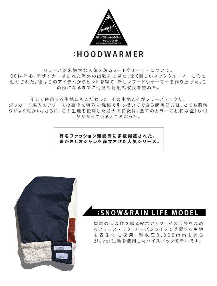抜群の保温性を誇るスタイリッシュなフードウォーマー! 抜群の保温性を誇るWボアとフェイス部分を温めるフリーステック、そして耐久性のある2LAYERやメルトン、パラフィン加工生地など、 アーバンライフで活躍する生地を表生地に採用。